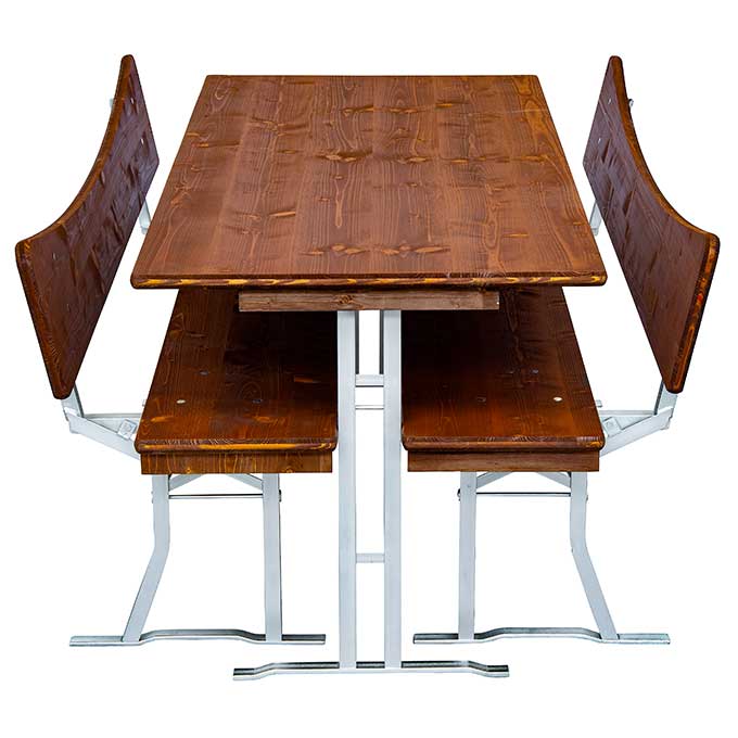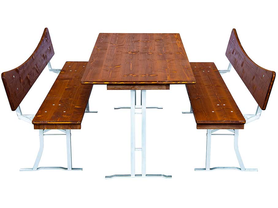 Das verwendete Tischgestell in umgekehrter T-Form bietet nicht nur maximale Freiheit für Ihre Beine, sondern ermöglicht es auch bei dem 80 cm breiten Tisch, die Bänke mit den Sitzflächen komplett unter den Tisch zu schieben. Dies erweist sich als platzsparende Lösung, wenn die Bierzeltgarnitur vorübergehend nicht benötigt wird und Sie von deren Demontage absehen möchten. Die Form der Rückenlehne ist konkav, was gemeinhin auch als eine nach unten gerichtete Auswölbung bezeichnet wird. Grundsätzlich können Sie diese Bänke mit Rückenlehnen mit verschiedenen Formen der Lehnen bei uns kaufen. Sofern sie eine eigene Form entwerfen, können wir diese realisieren.