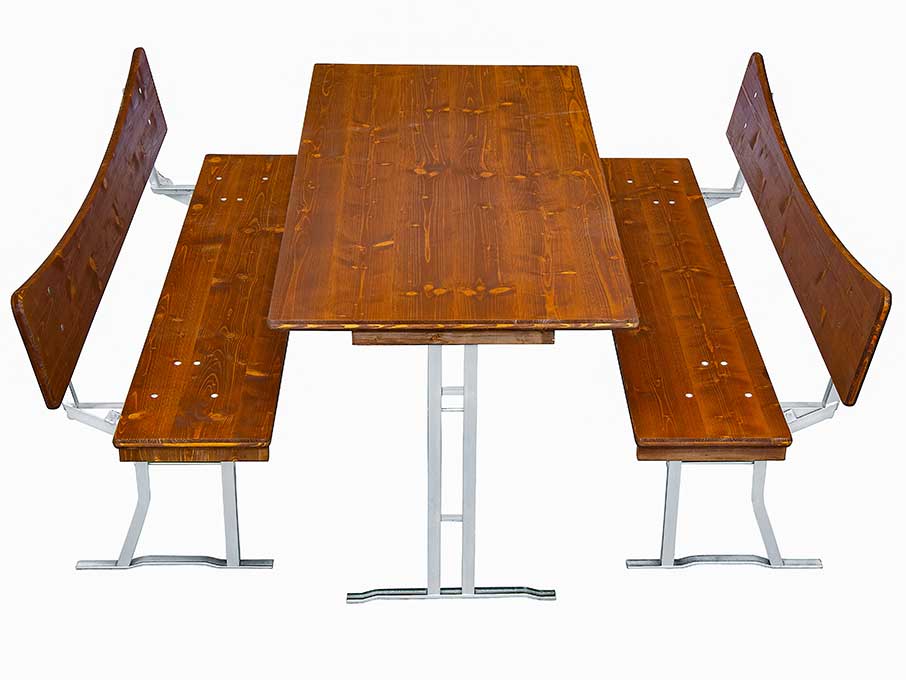 Bei dieser Bierzeltgarnitur können Sie die Bänke unter den Tisch stellen