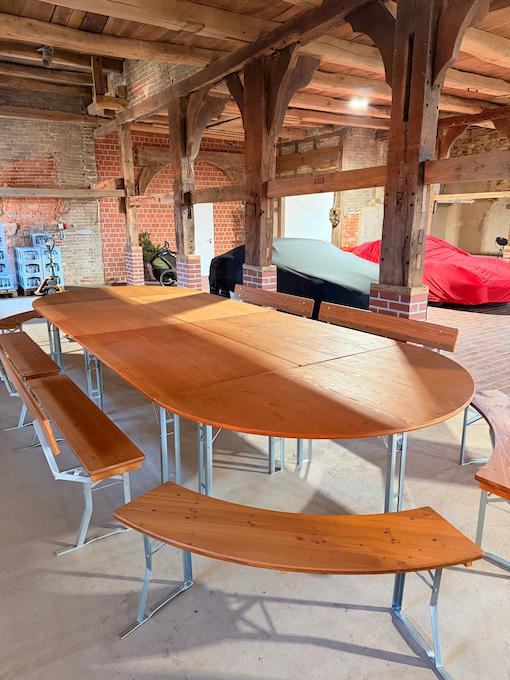Eine sehr beliebte Variante zu dieser Bierzeltgarnitur sind Biertische mit den Abmessungen 200 cm × 100 cm mit extra viel Beinfreiheit. Es ist möglich, diese in der Biertischgarnitur sowohl längs als auch quer zu positionieren. Sie können zwischen den Rundtischhälften beliebig viele dieser Tische einfügen. Dadurch kann diese Garnitur unendlich erweitert werden. Das funktioniert sogar um die Ecke. Diese Bierzeltgarnituren werden sehr häufig in großen Festscheunen verwendet