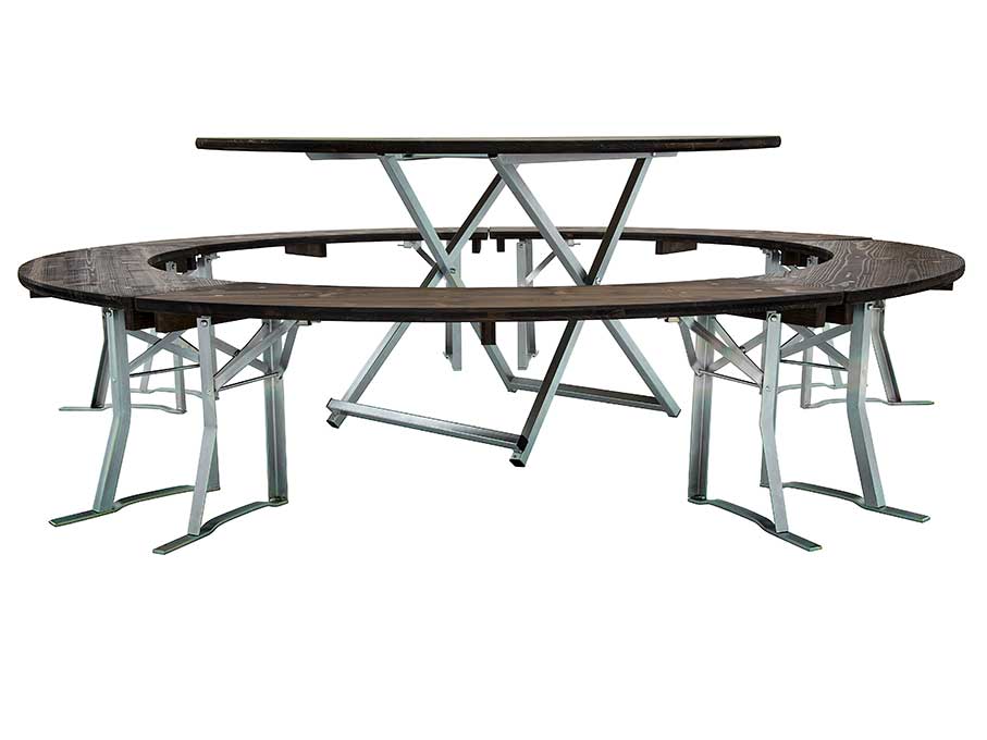 Bierzeltgarnitur in Rundform, Holzplatten lasiert im Farbton Ebenholz, Gestelle verzinkt. Rundtisch 150 cm Durchmesser, mit 4 Bänken entsteht eine Durchgangsmöglichkeit und mit 5 Bänken ein Kreis. Jede Bank hat eine Gesamtlänge von 140 cm und eine Sitztiefe von 30 cm, allerdings entsteht durch die gebogene Form eine größere Sitztiefe und auch die Banklänge im Kreis gemessen beträgt ca. 150 cm.