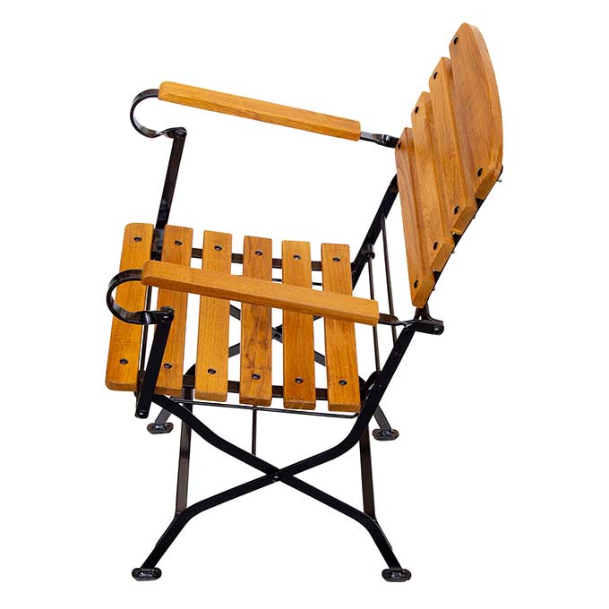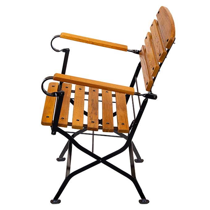 Die Armlehnen bestehen aus einem gebogenen Stahl und haben eine Handauflage aus Robinie, die ebenfalls gebogen ist. Die Handauflage aus Robinienholz ist mittels mehrerer Schrauben von der Unterseite her fixiert. Um bequemeres Sitzen zu ermöglichen, ist die vordere Latte nach unten geneigt. Die Sitzfläche hat eine Sitzmulde. Das heißt, die Sitzfläche hat eine Biegung, die auf den Körper zugeschnitten ist. Der tiefste Punkt der Sitzfläche ist in der Mitte der Sitzfläche zwischen den mittleren Latten. Diese Terrassenmöbel sind für den Gebrauch im Innenbereich als Gastronomiebestuhlung und im Außenbereich wie Biergärten, Terrassen oder Rasenflächen bestens geeignet.
