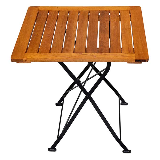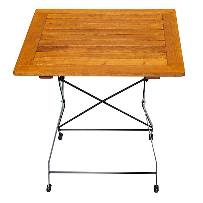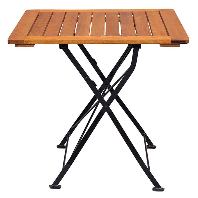 Man kann diese Möbel den Kategorien Terrassenmöbel, Biergartenmöbel und Klappmöbel zuordnen. Der Terrassentisch ist klappbar und hat eine Tischfläche von 80 cm × 80 cm. Die Tischplatte besteht aus wetterfester Robinie und ist mit einem Rahmen ringsherum versehen. Der Rahmen ist an jeder Ecke mit speziellen Verbindungsleisten von unten verleimt und verschraubt. Die Eckverbindungen verhindern das Verdrehen der Rahmenleisten am Stoß. Durch die exakte Verarbeitung der einzelnen Bretter ist kein Höhenunterschied der einzelnen Bretter vorhanden, was besonders wichtig für die Eckverbindung am Rahmen ist. Das aus Bandstahl gefertigte Tischgestell ist klappbar. Die Oberfläche des Tischgestells ist verzinkt und zusätzlich schwarz pulverbeschichtet. Die Gelenke der Tischgestelle bestehen aus Schweißnieten und sind spielfrei.