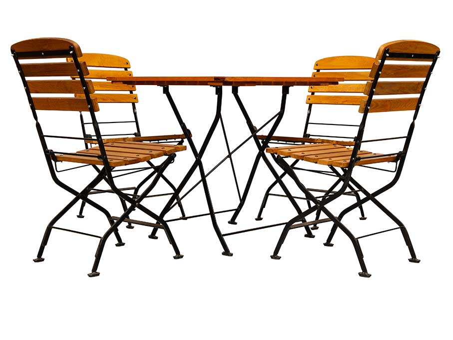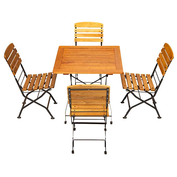 Perfekte Gastronomie-Qualität und hervorragende Verarbeitung zeichnen diese Terrassen-Bestuhlung aus Holz und Stahl aus. Der Stuhl Modell 01tm ist in unserem Terrassenmöbel-Sortiment der am meisten verkaufte Stuhl mit einem Anteil von mindestens 60 Prozent. Bei den Biergartenmöbeln ist das ähnlich, das Modell 01bg ohne Armlehne hat ebenfalls einen Anteil von mindestens 60 Prozent. Das Set besteht aus einem quadratischen Tisch und vier Stühlen.