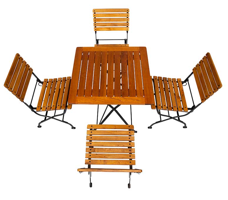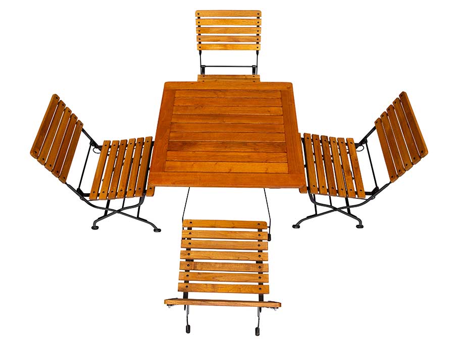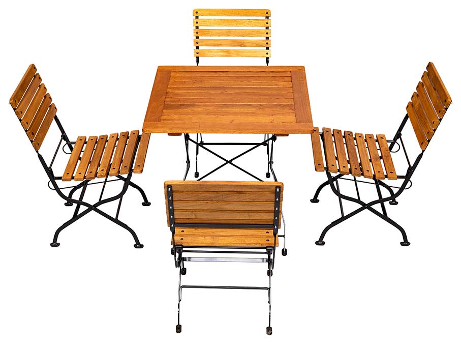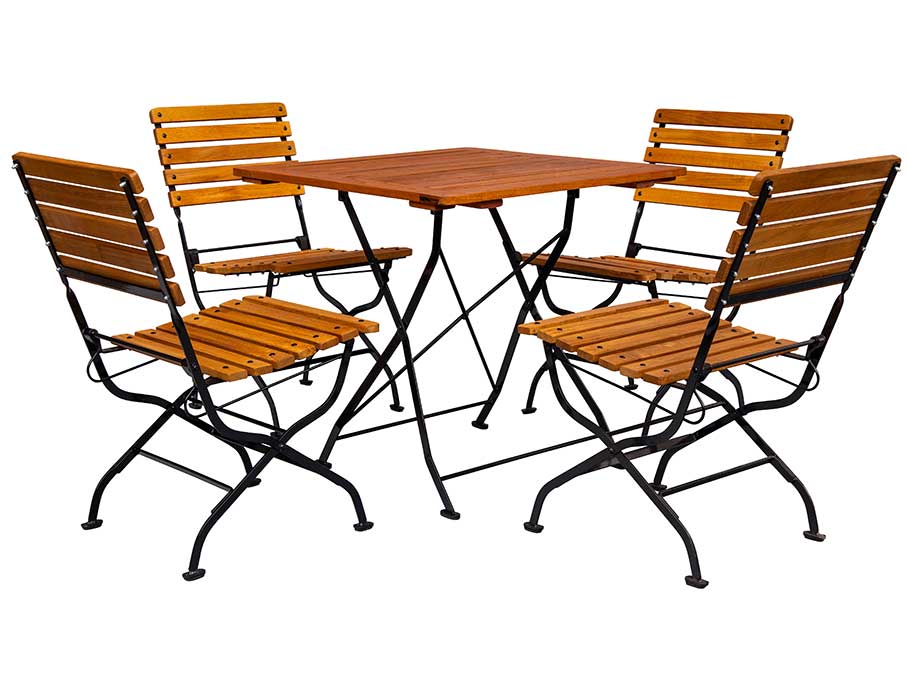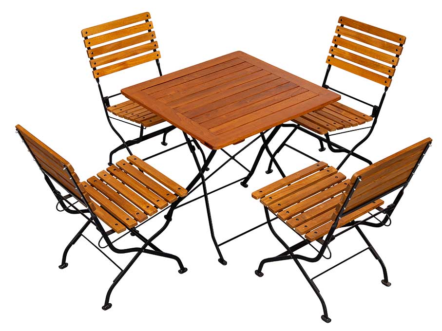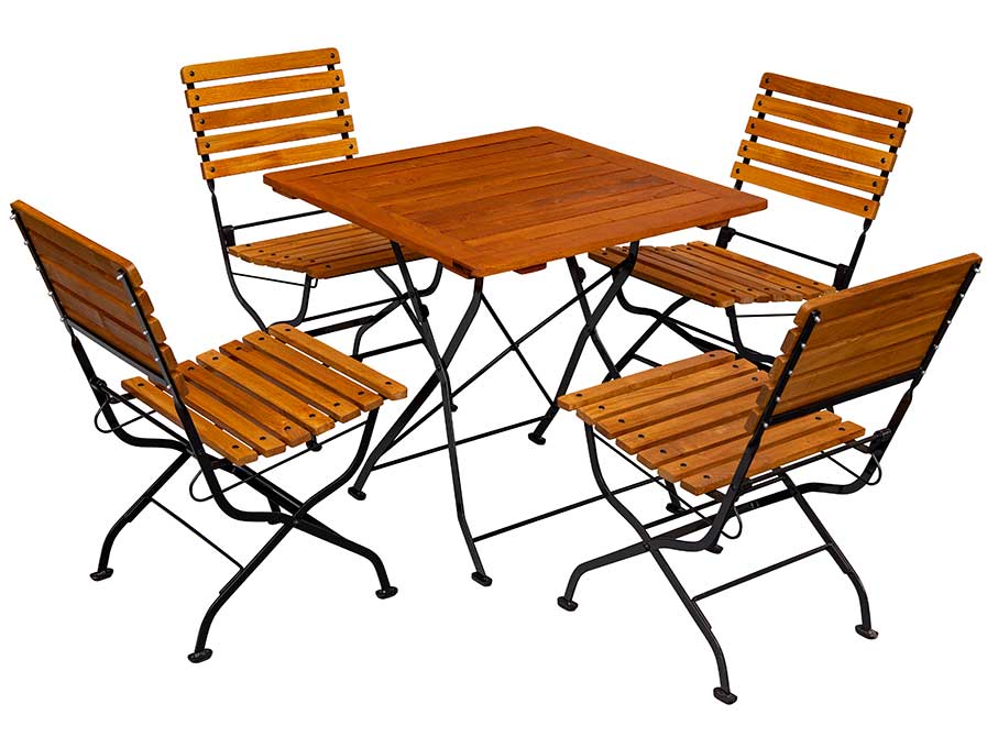 Kleine Essgruppe aus Terrassenmöbeln, fünfteilig, mit vier komfortablen, klappbaren, extra, breiten Stühlen. Der Tisch ist quadratisch mit einer Kantenlänge von 80 cm und einer Aufstellhöhe von 75 cm. Der Esstisch bietet ausreichend Platz für vier Gäste. Die klappbaren Stühle mit einer Sitzbreite von ca. 46 cm und einer Sitztiefe von ebenfalls 46 cm sorgen für optimalen Sitzkomfort. Dank der ca. 46 cm hohen Rückenlehne sitzen Sie ergonomisch und sehr bequem.