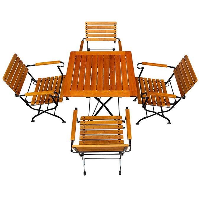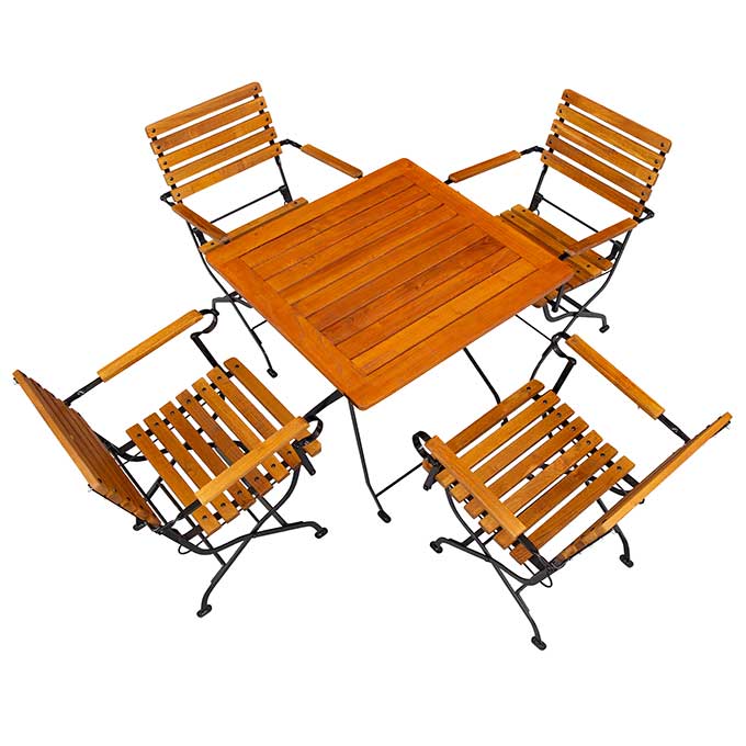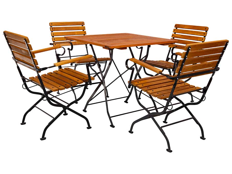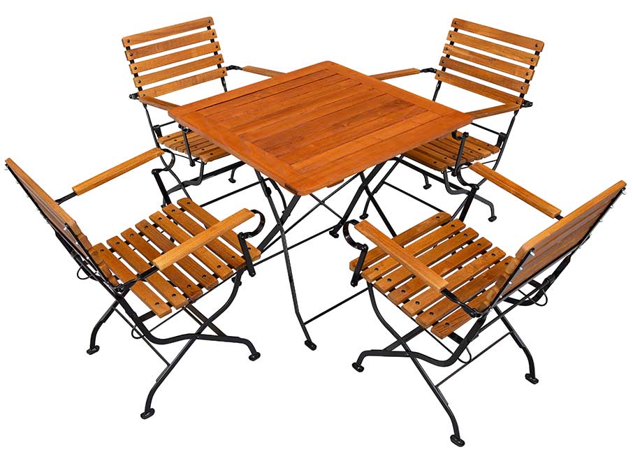 Die kleine Essgruppe unserer Terrassenmöbel umfasst einen quadratischen Esstisch mit einer Tischplatte von 80 cm Seitenlänge sowie komfortable XXL-Stühle. Das Set besteht aus fünf Teilen, die alle zusammengeklappt werden können. In erster Linie wird das fünfteilige Terrassenmöbel-Ensemble in Cafés und Restaurants verwendet.